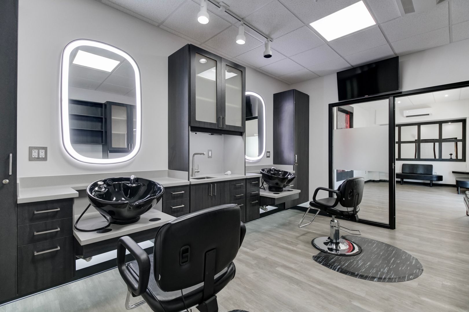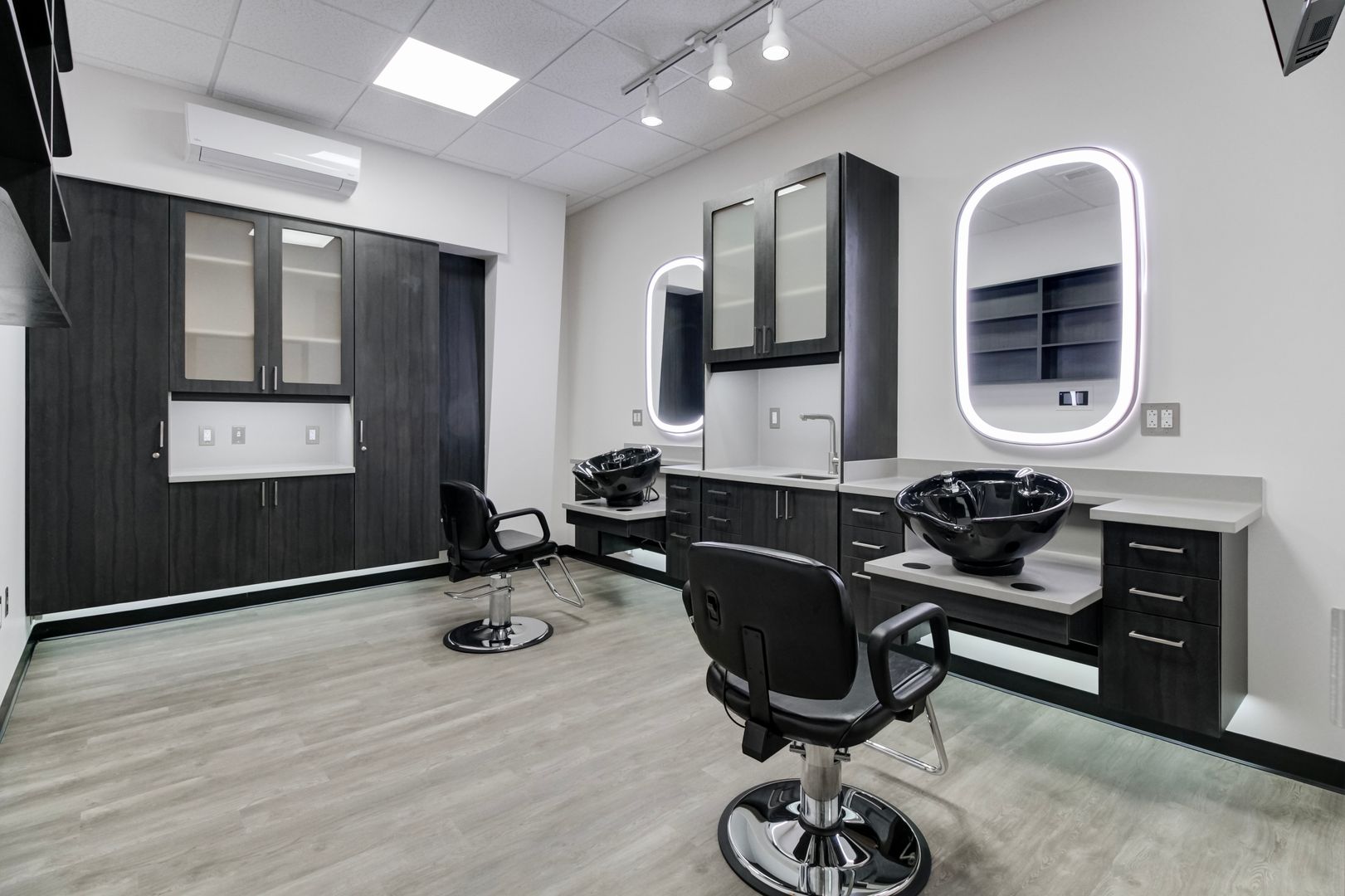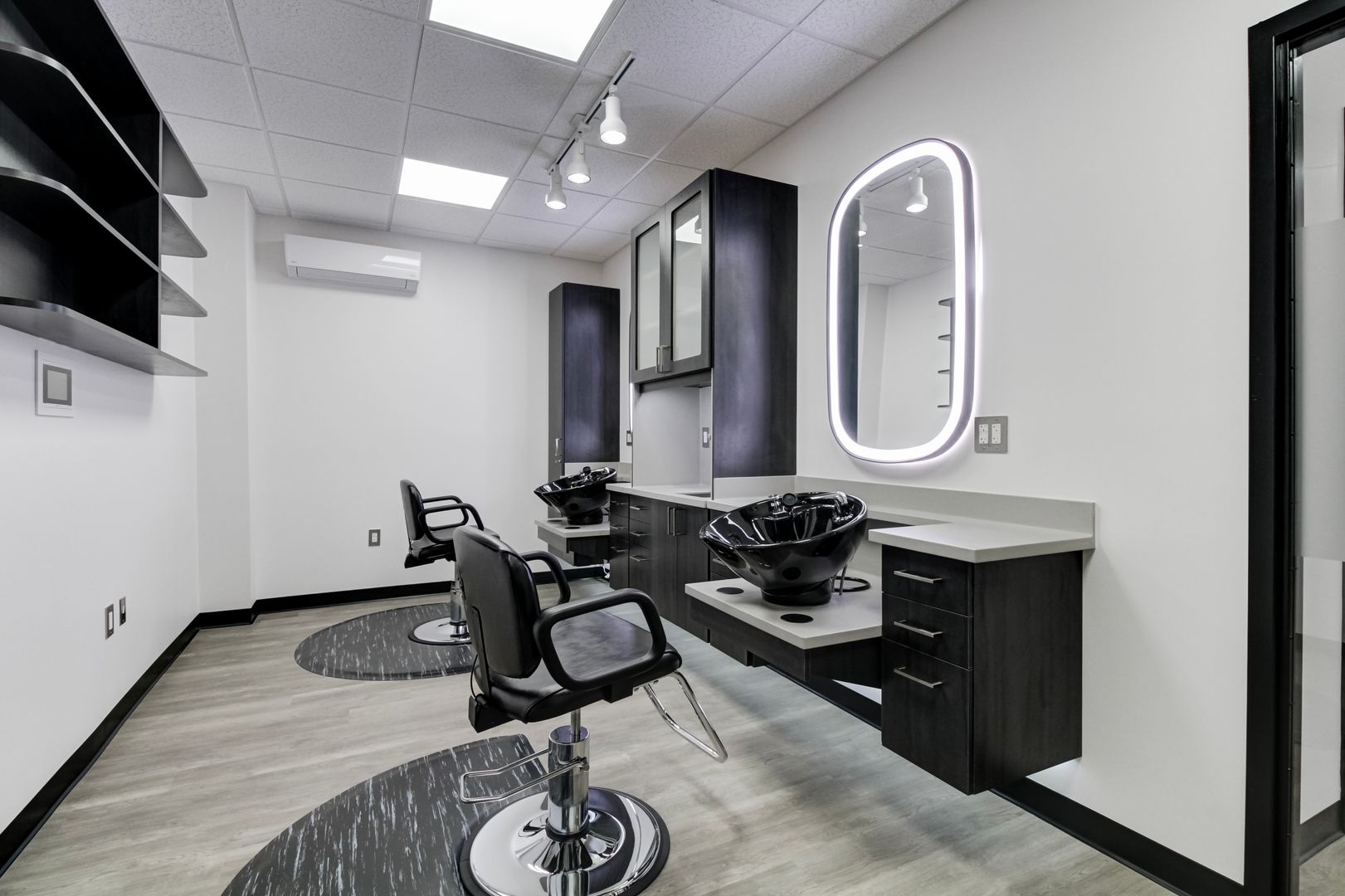 -Each suite is equipped with salon chairs, back lit mirrors, lockable storage cabinets, display