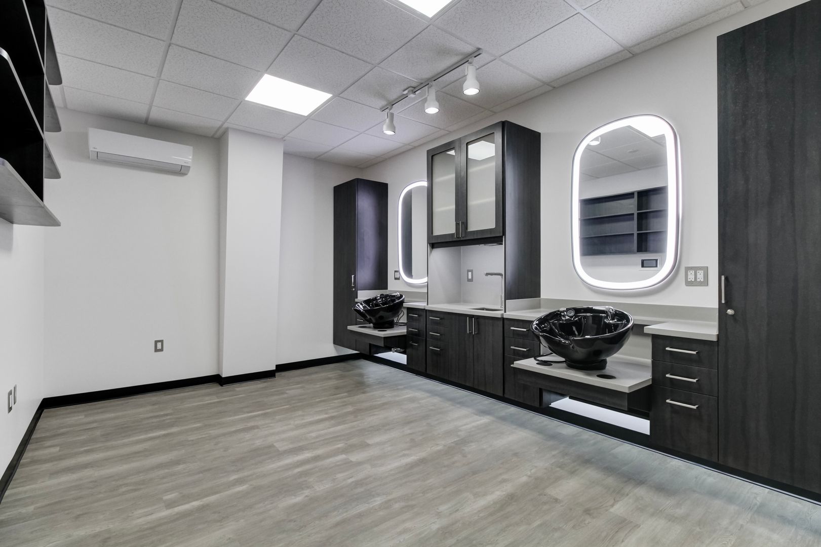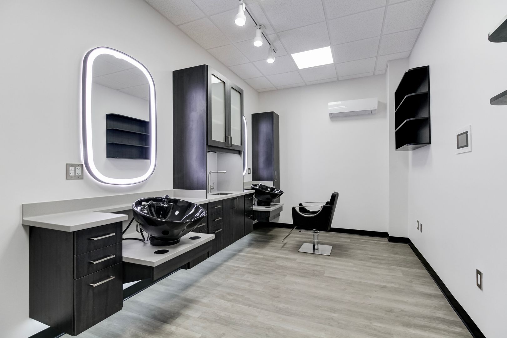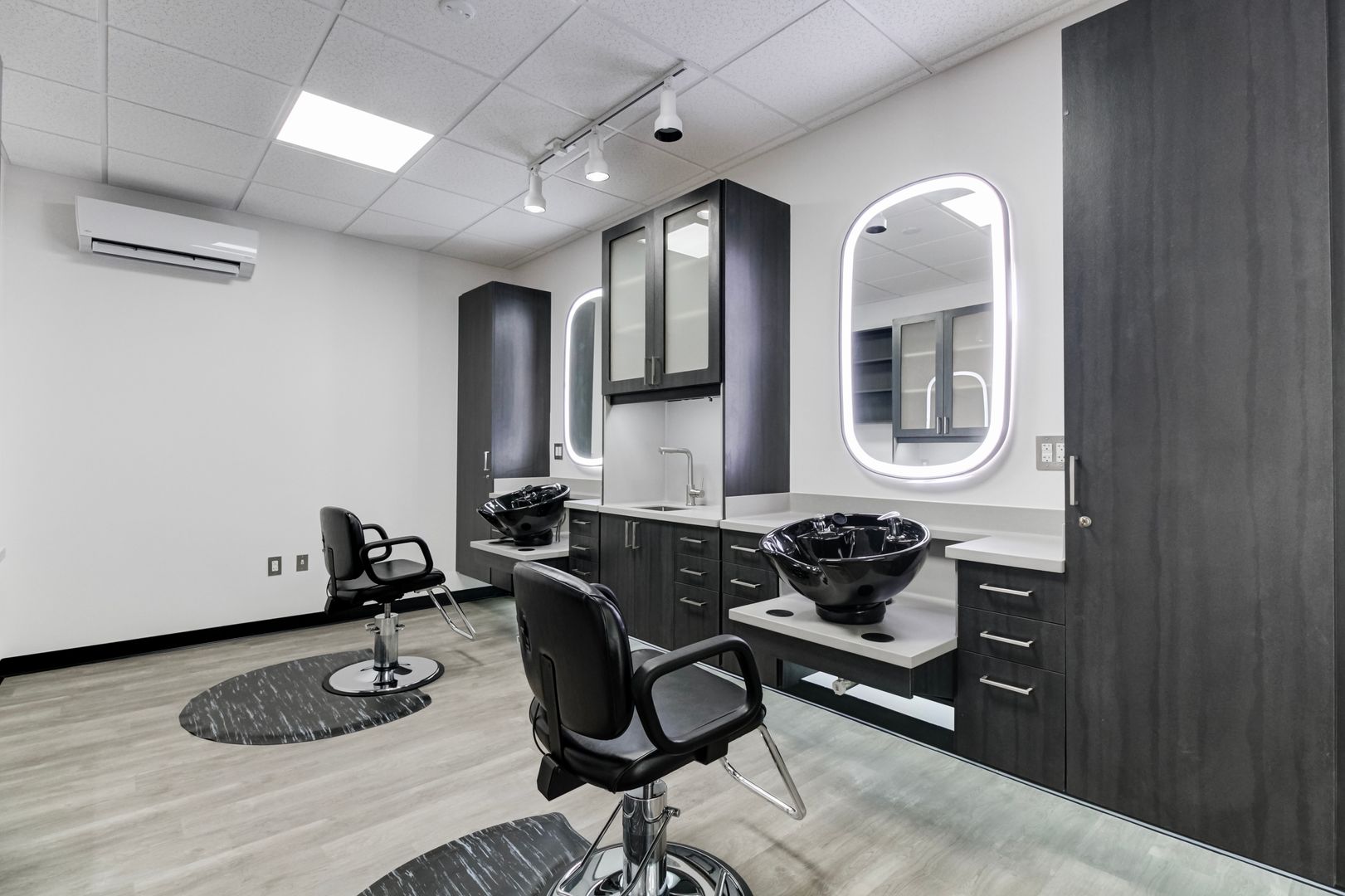 -Each suite is equipped with salon chairs, back lit mirrors, lockable storage cabinets, display