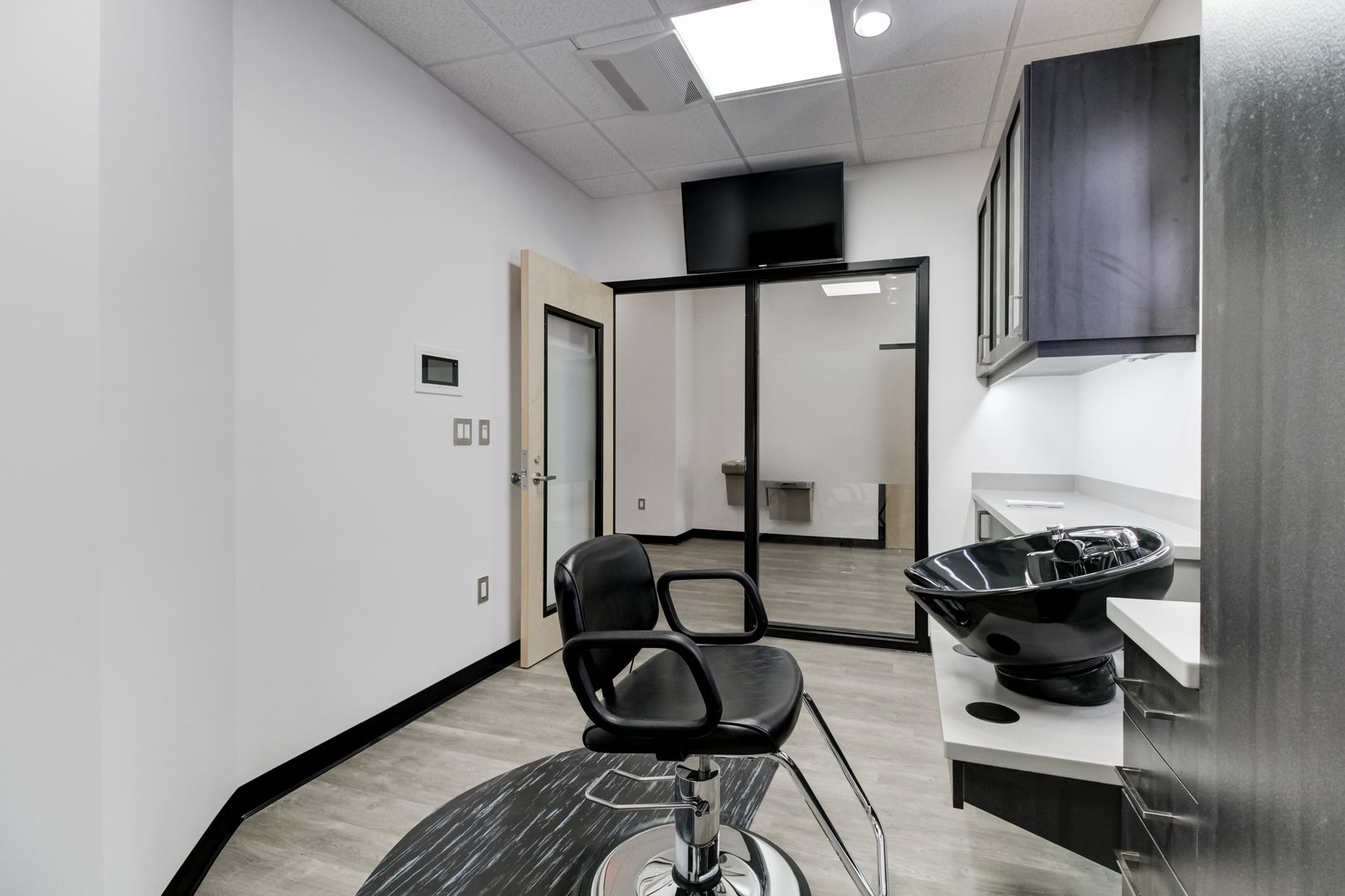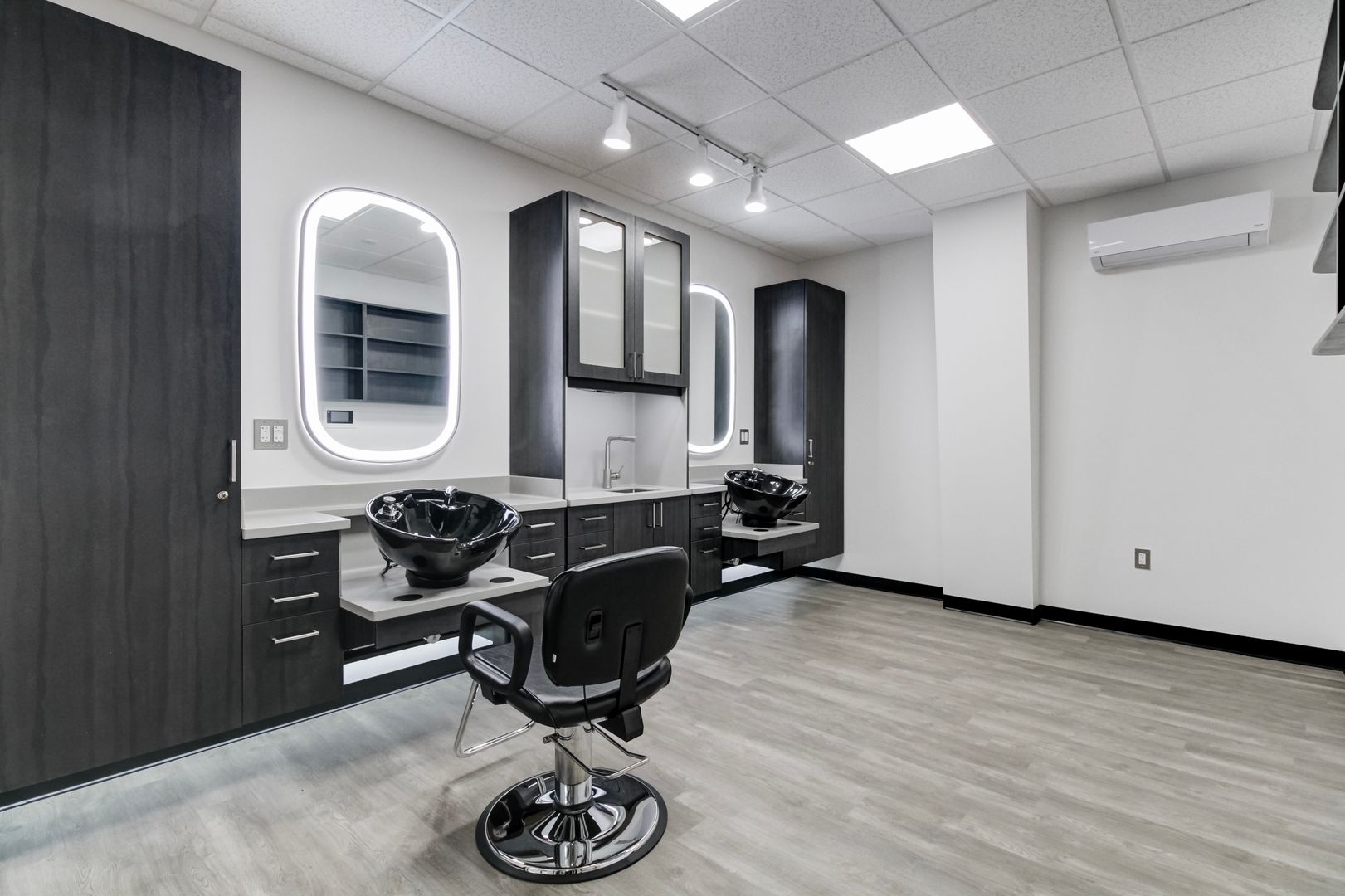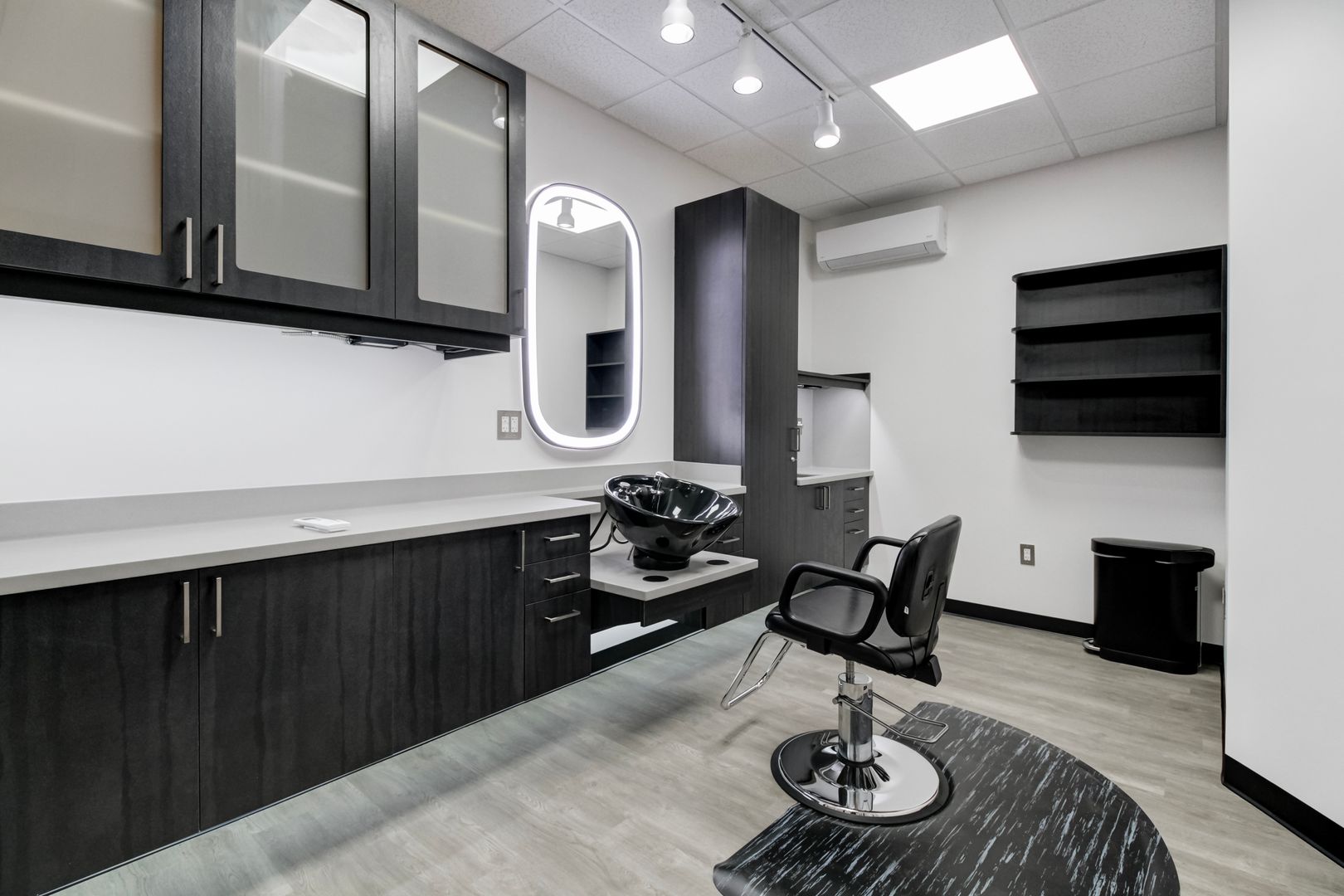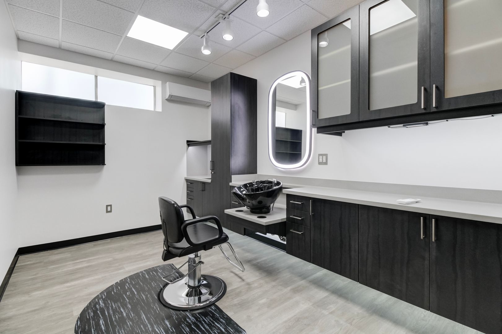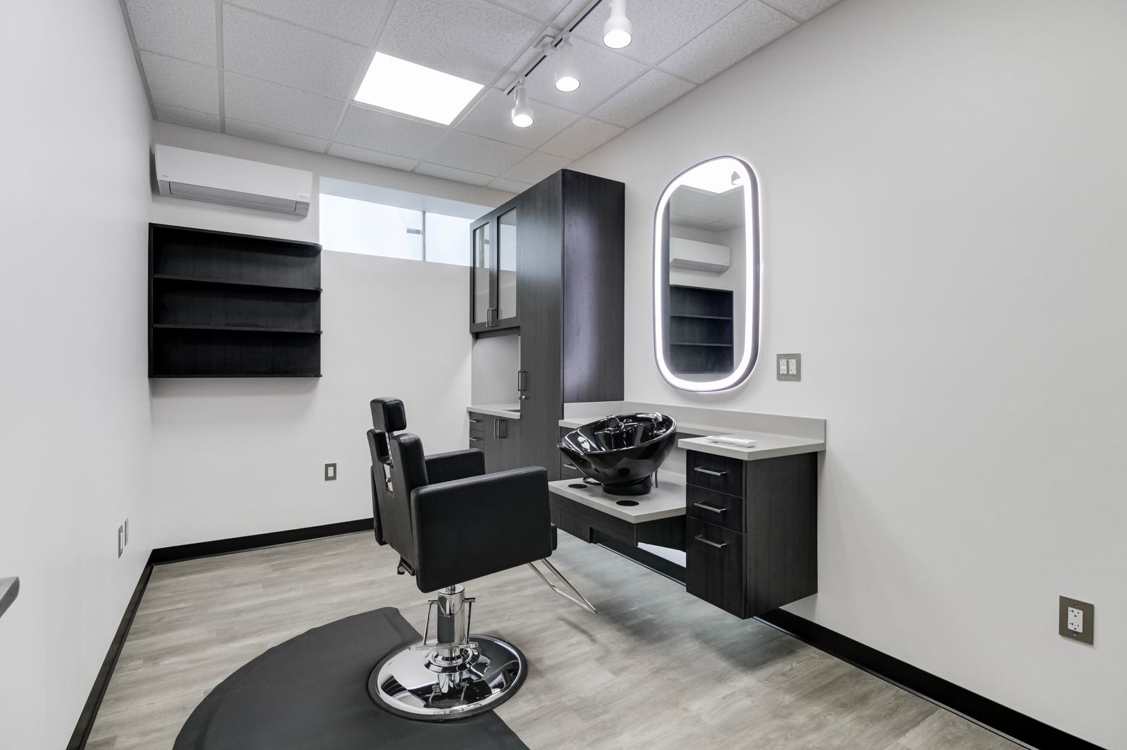-Each suite is equipped with salon chair, back lit mirror, lockable storage cabinets, display